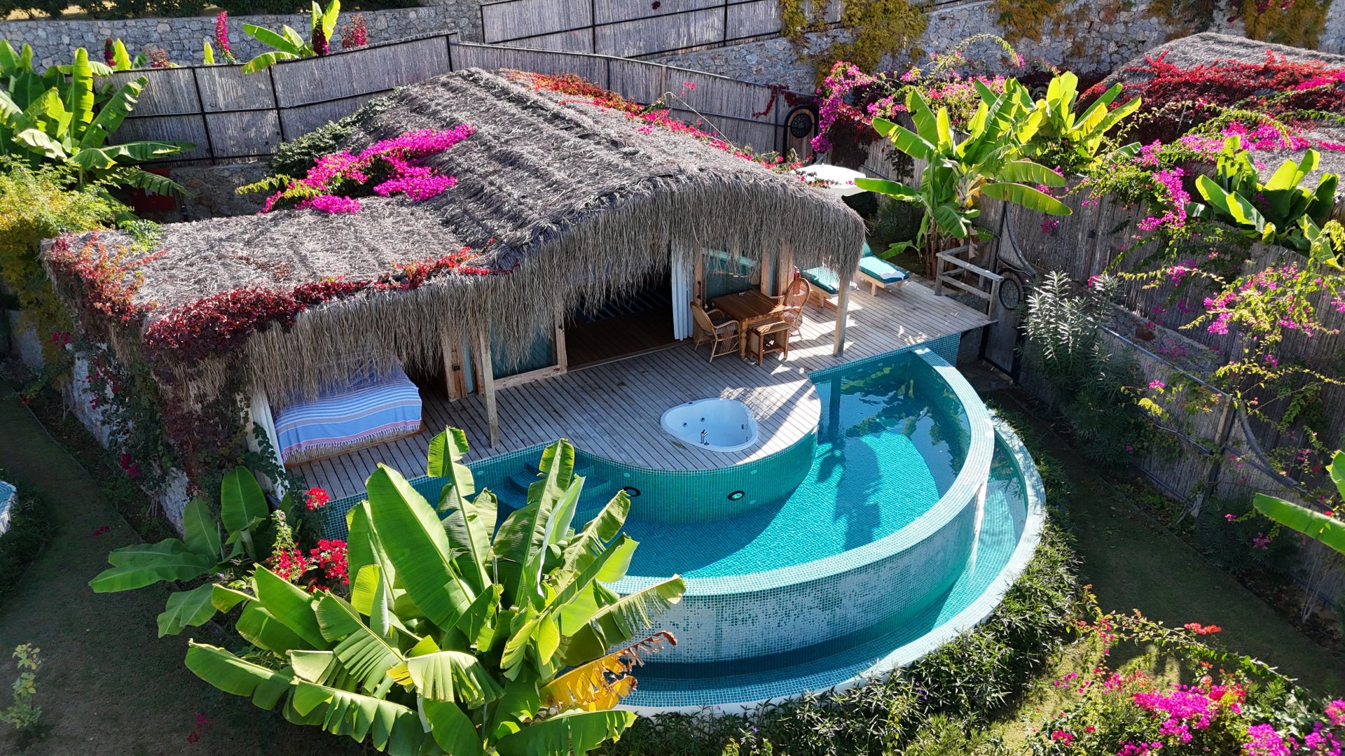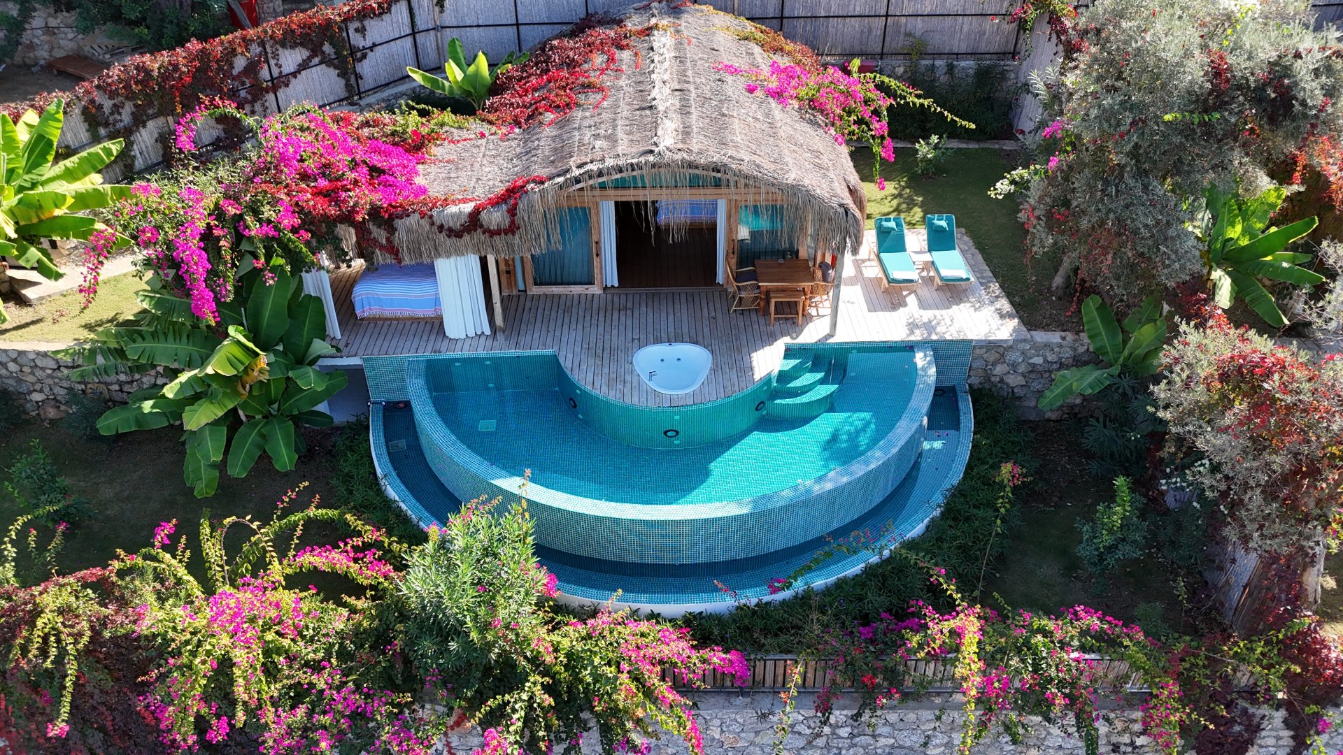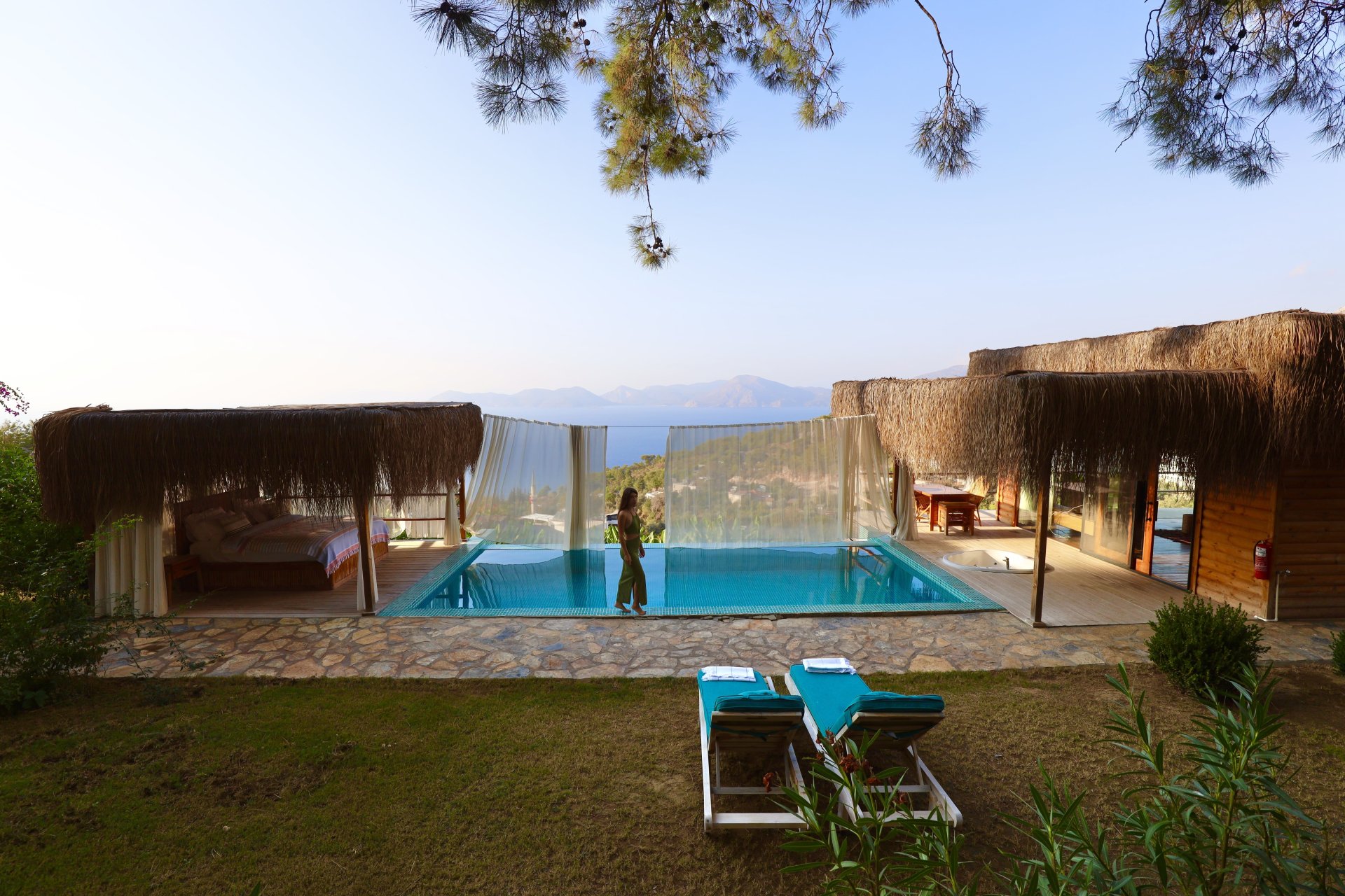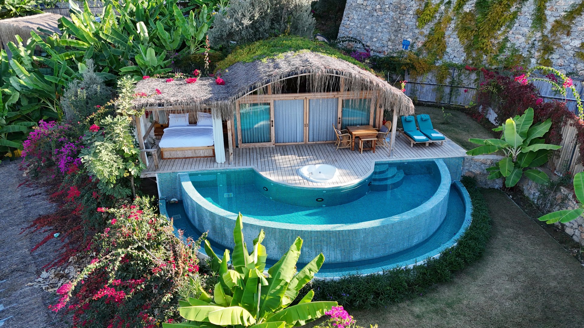 Kekik süitimiz özel havuzlu ve jakuzilidir. Havuz başında etrafı tüllerle çevrili dış yatak mevcuttur.