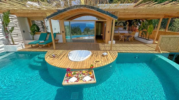 Mercan odamız, deniz manzaralı, özel havuzlu ve jakuzilidir. Dış yatak ve dış duş mevcuttur.